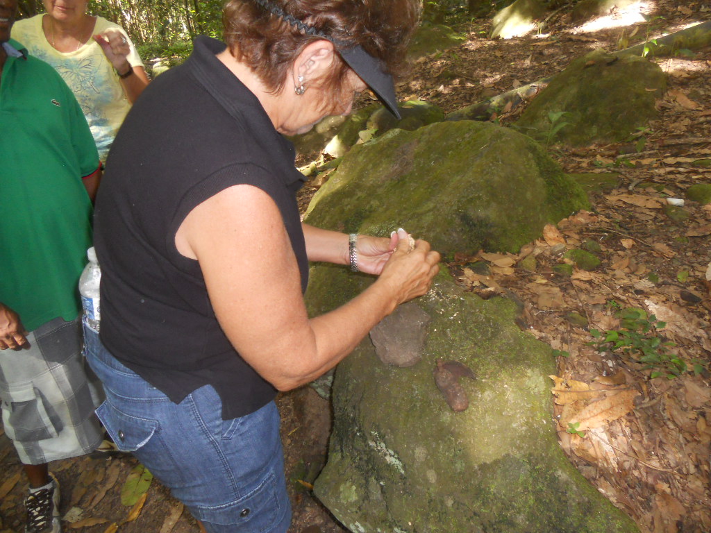 By 8:30 a.m, we were in Anthony’s van on our way to a pick up site to the Rain Forest. Costilla, one of the few female taxi drivers on the island, met us at a prearranged site with her equally new, clean van and took us to pick up our guide, Belta, for the 2 1/2 walk in the forest. Costilla has 6 children, four grown and two teens, and has lived on the island all her life. She has very little accent and is very easy to understand so we asked her lots of questions about the people including about the dreadlocks. It seems the dreadlocks started as an alternate religion, Rastafari movement, and has progress to more of a style thing, which has upset the true believers.