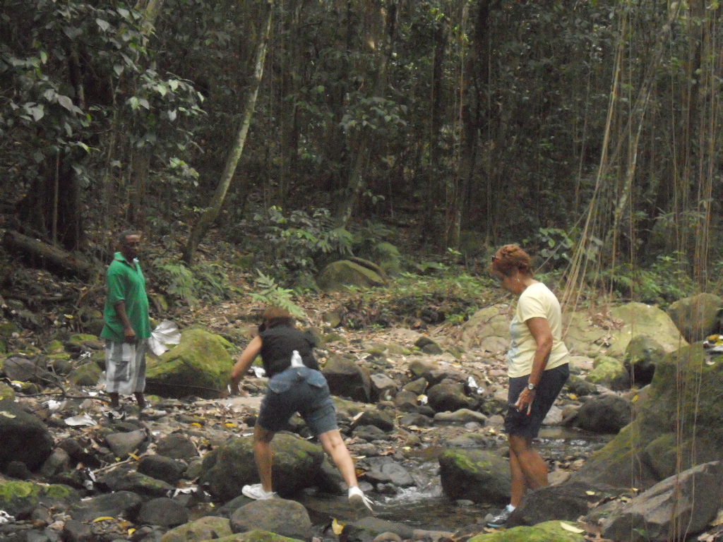 We walked up the hill to where the government has the water collection sites fenced off because all the water for the island comes out of the Rain Forest and they want to keep it clean and pure. This meant we had to cross over several shallow streams with slippery stones with Belta’s help pointing to the proper stone to step on. On one of these trips across, I was doing fine, as illustrated by the photo below,