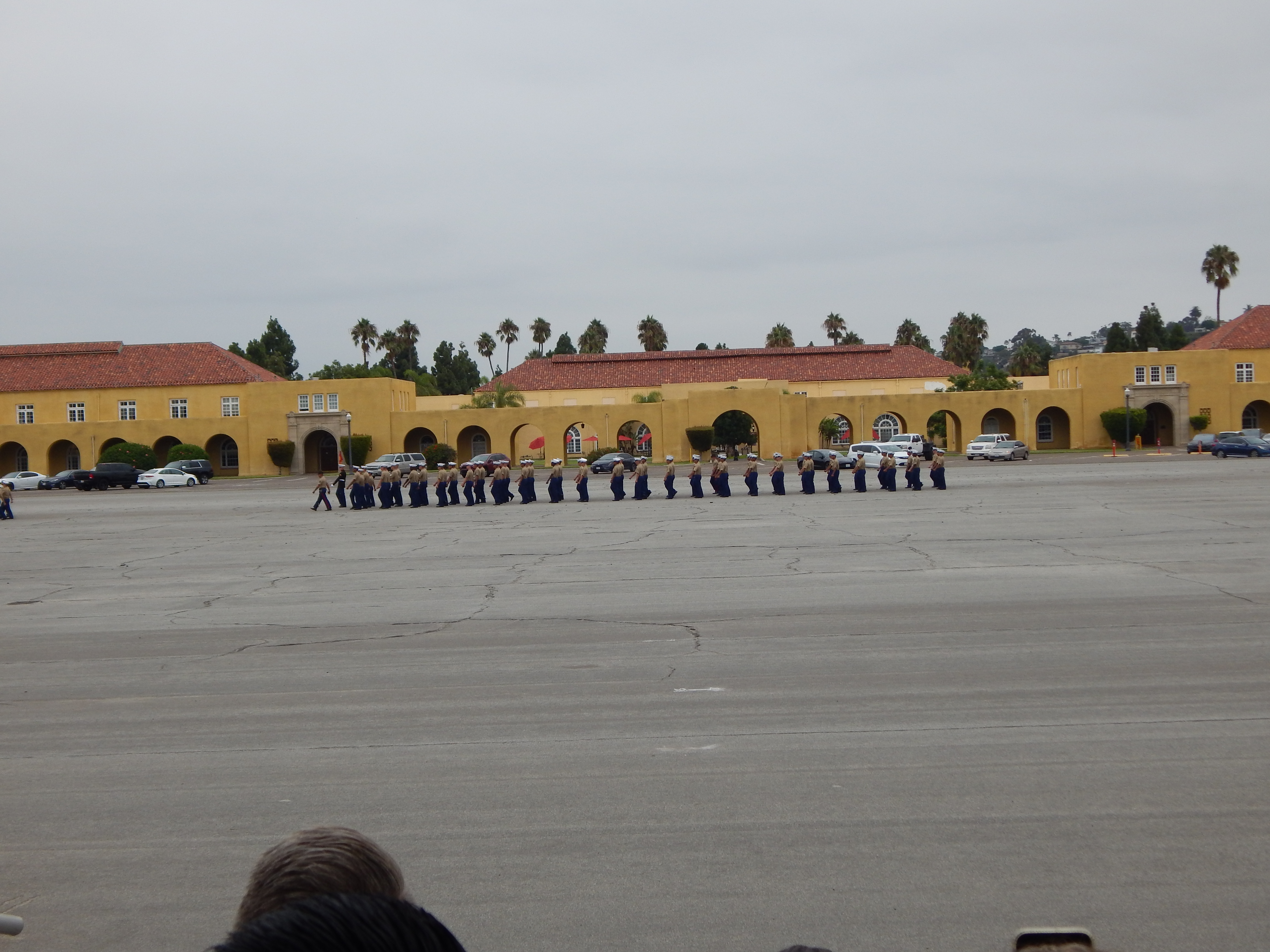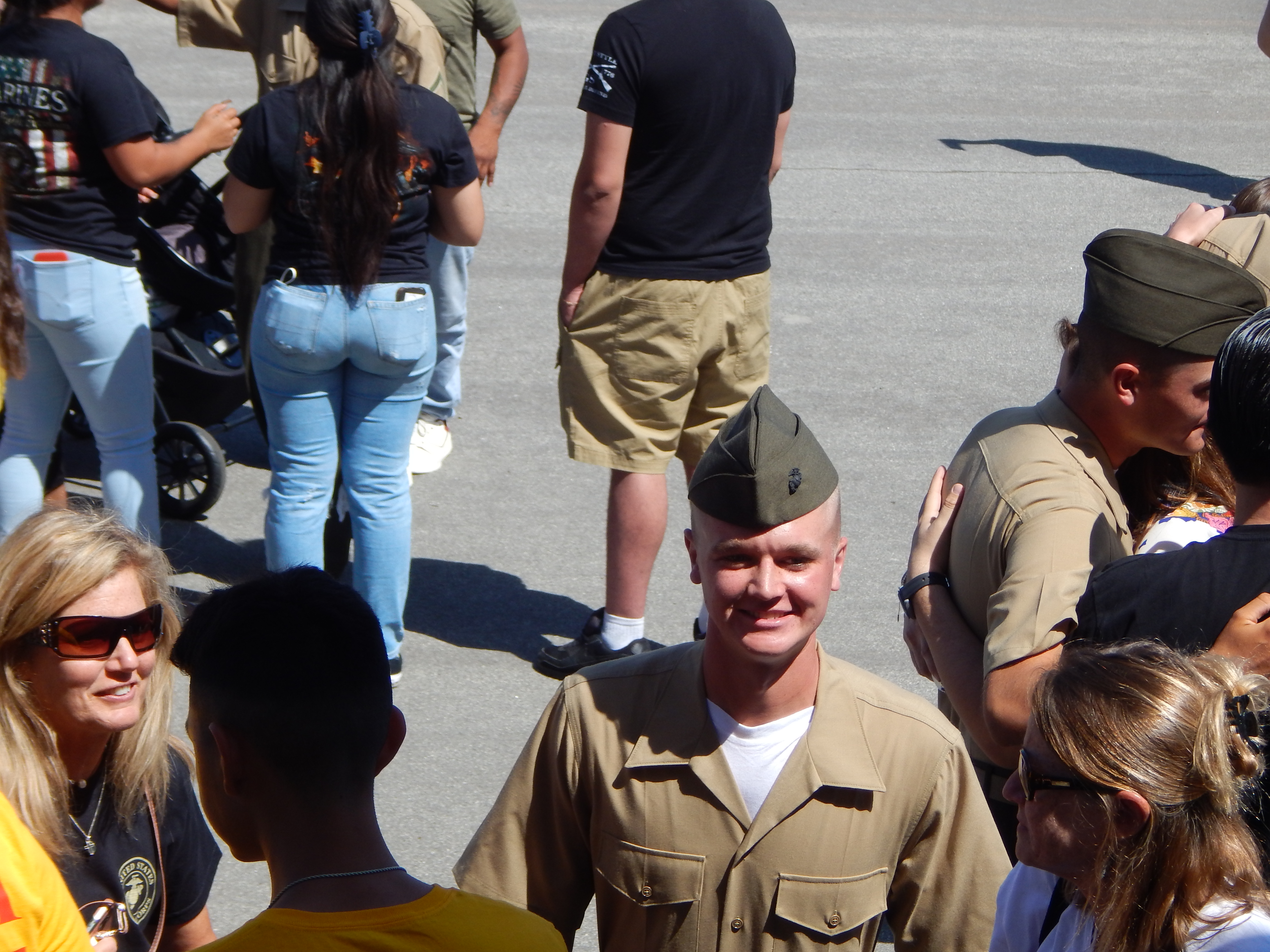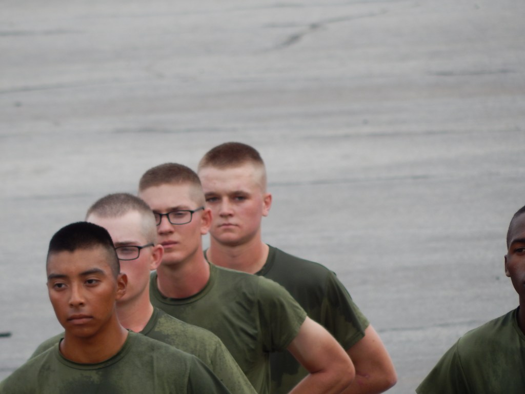 Graduation Day was another early morning when the access to the base started at 6:30 a.m. preceded by the full car and people inspection. Only today, there was twice as many people because many folks could only come for the one day and had to miss family day. In fact, we had three arrive last night to add to our number as well. Uncle Ward, cousin James, and brother Kyle all arrived late last night, so most of the family was making a big sacrifice getting up early enough to be on time. We all had matching t-shirts that said, Proud Marine, Mom, Dad, Grandpop, etc.”, hoping it would make it easier for him to find us.