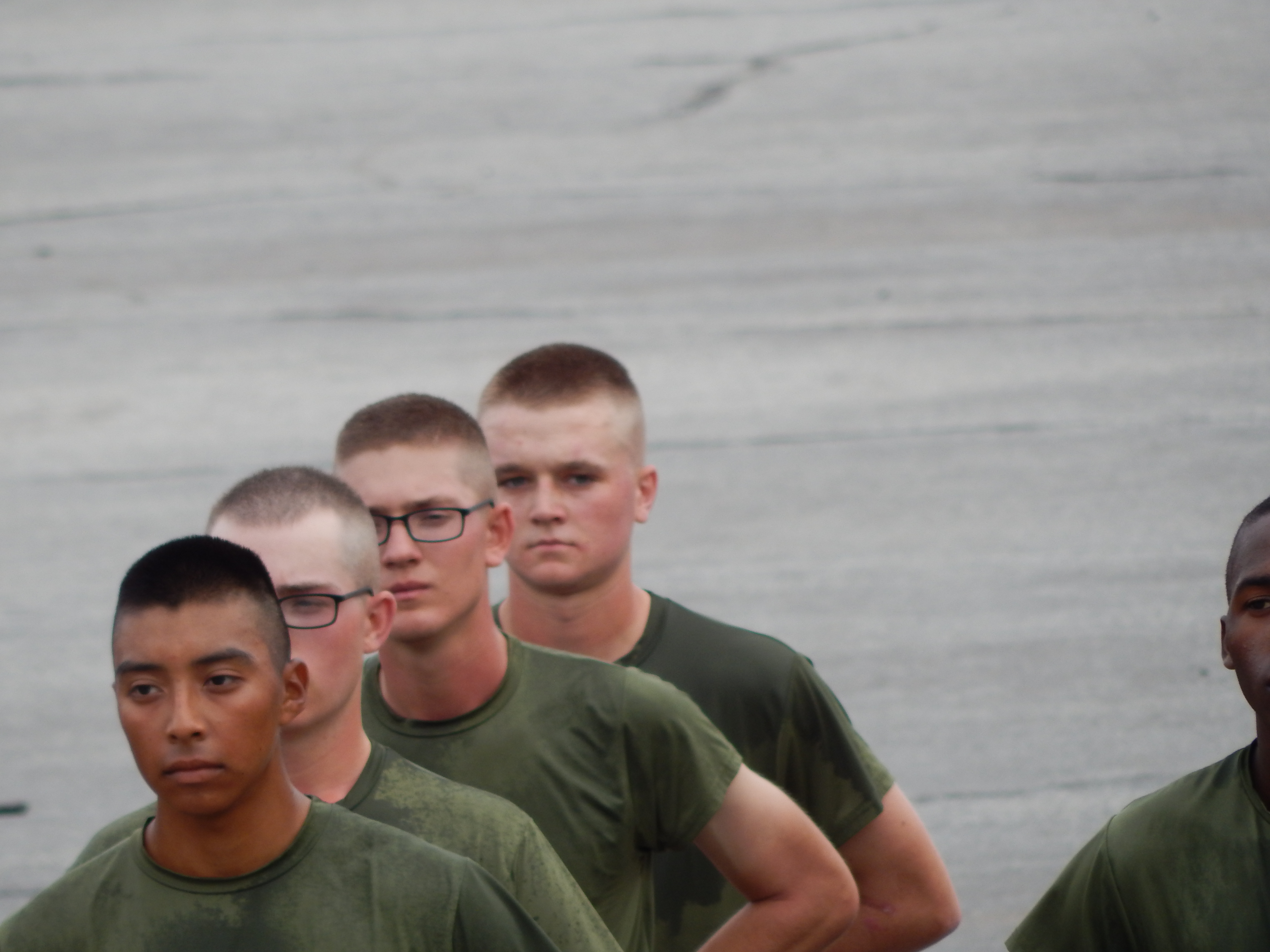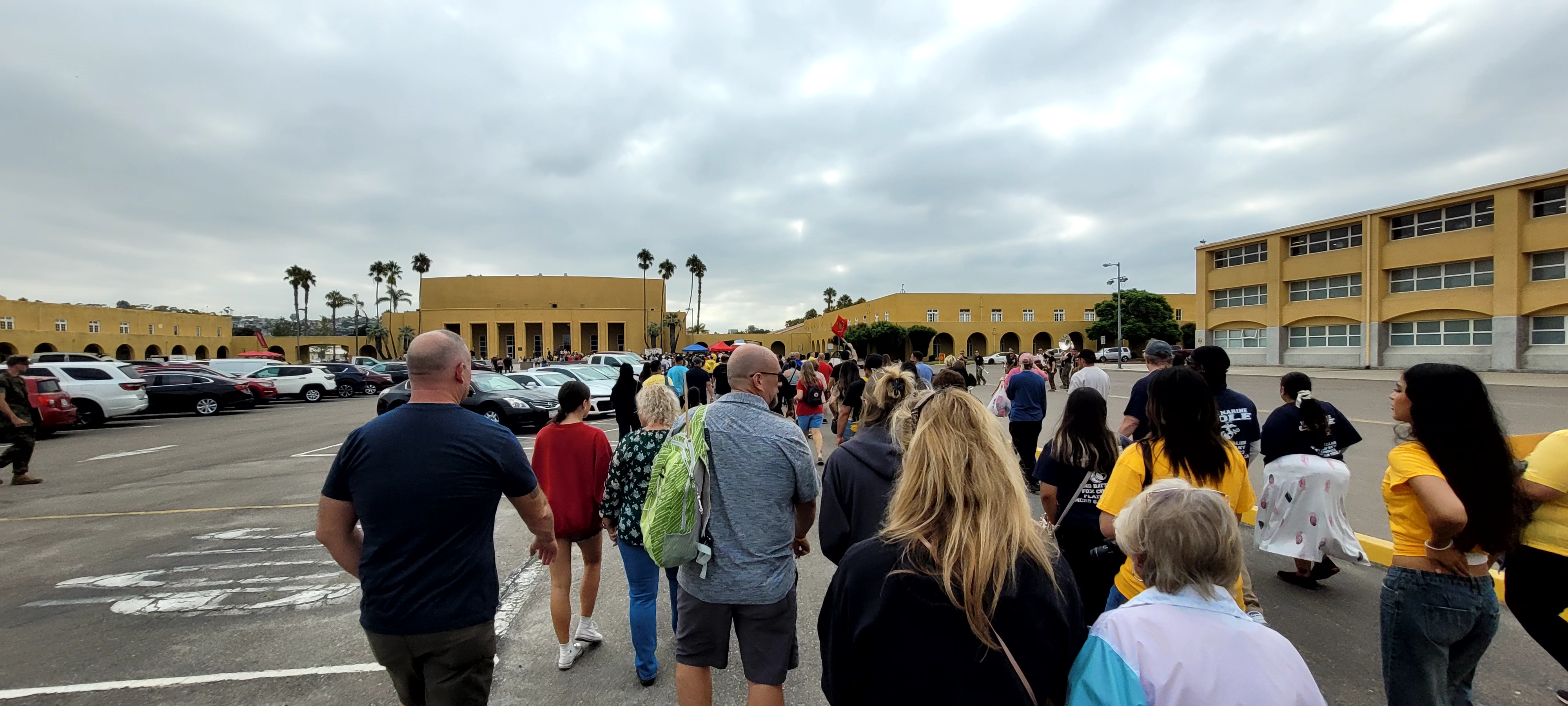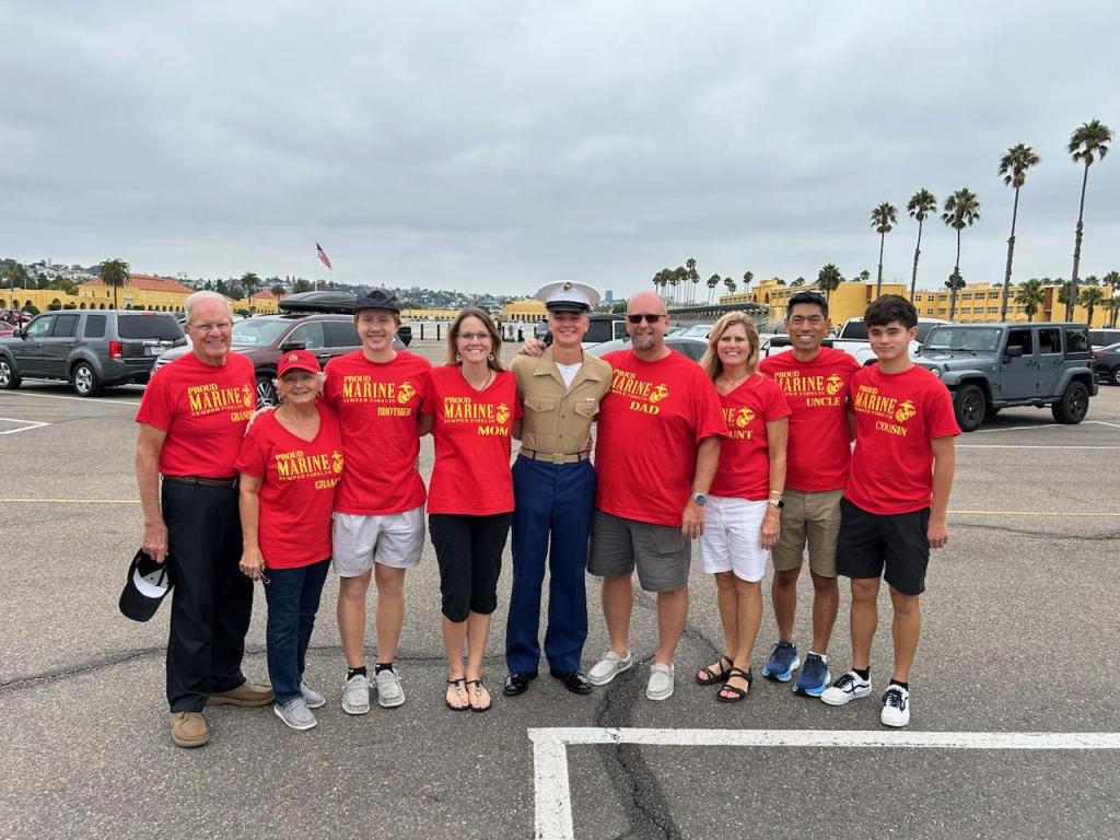 Graduation Day was another early morning when the access to the base started at 6:30 a.m. preceded by the full car and people inspection. Only today, there was twice as many people because many folks could only come for the one day and had to miss family day. In fact, we had three arrive last night to add to our number as well. Uncle Ward, cousin James, and brother Kyle all arrived late last night, so most of the family was making a big sacrifice getting up early enough to be on time. We all had matching t-shirts that said, Proud Marine, Mom, Dad, Grandpop, etc.”, hoping it would make it easier for him to find us.